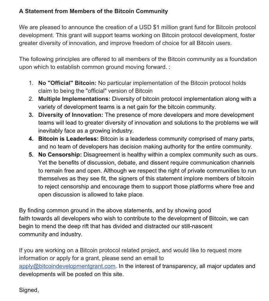 El rumor apareció en las redes sociales a través de un tweet de Samson Mow, en el cual el COO de la casa de cambio china BTCC mencionaba que había recibido una información de manera anónima donde se declaraba la creación de un fondo de inversión de un millón de dólares para impulsar el desarrollo de mejoras al protocolo de Bitcoin, y una lista de principios comunes de los miembros asociados a la iniciativa.