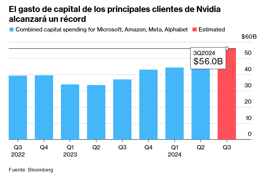 Los analistas de Bloomberg han proyectado que, en conjunto, estas compañías podrían haber alcanzado un gasto récord en capital de aproximadamente 56.000 millones de dólares en el tercer trimestre, como se aprecia en el siguiente gráfico.