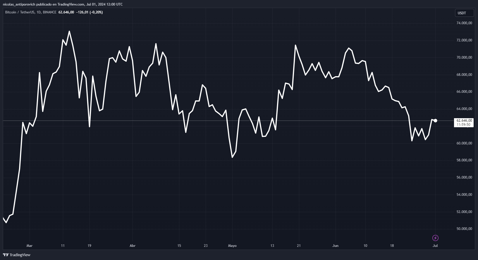 El séptimo mes de 2024 ha comenzado. El precio de bitcoin, en la primera mitad del año, tuvo un comportamiento que sorprendió al mundo al alcanzar un nuevo máximo histórico antes del halving. Pero, luego de eso, entró en una zona de lateralización que lo ha mantenido oscilando entre los 56.000 dólares y los 72.000 dólares desde entonces.