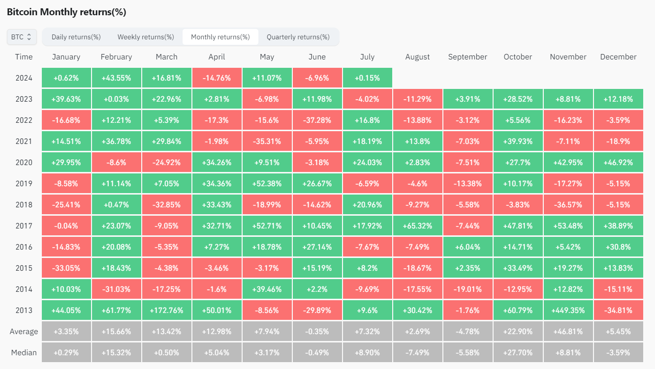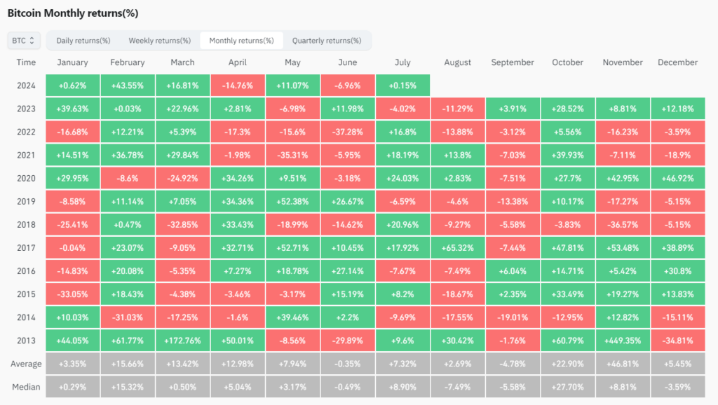 A continuación puede verse el retorno mensual histórico de bitcoin, en una tabla provista por CoinGlass: