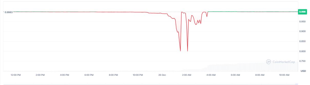 Durante la madrugada del 26 de diciembre, la presión de venta en exchanges descentralizados (DEX) como Orca y Raydium superó la liquidez disponible, lo que provocó que el precio de USX cayera por debajo del dólar en esos mercados.