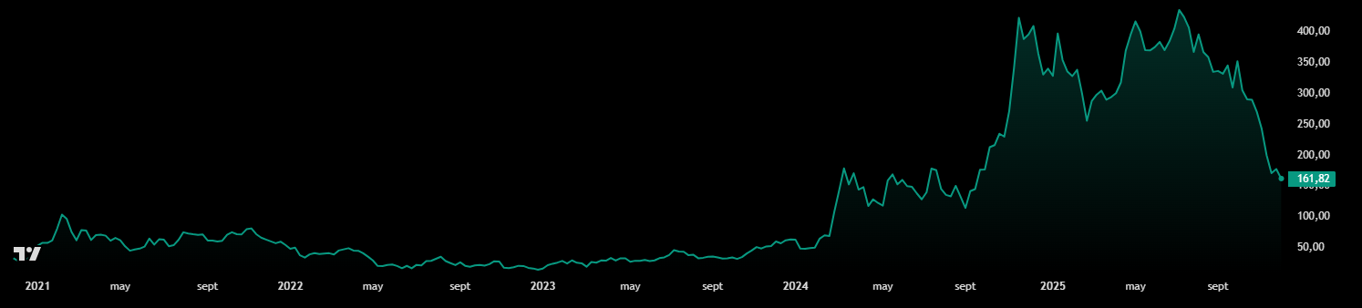 El analista es categórico al advertir que “el que no entienda esto de Strategy puede perder mucho dinero”. Tras una corrección del 70% desde sus máximos históricos como se aprecia en el gráfico. El analista afirma con convicción: “las acciones son un regalo a estos precios”.