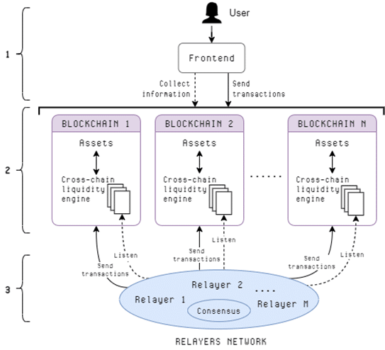 Finalmente, las transacciones pasan a la red de retransmisores, un software específico ejecutado por una organización o individuo en una red P2P descentralizada. Los retransmisores procesan los datos emitidos por el motor de liquidez entre cadenas, llegan a un consenso, y firmán y envían las transacciones a la blockchain correcta.