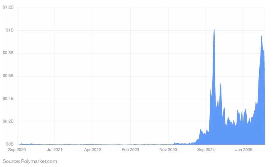 En ese marco, los mercados de predicción ocupan un lugar especial. CoinShares describe a Polymarket como “una fuente de probabilidad más precisa que las encuestas tradicionales”. Ello, sumado a que esa plataforma de apuestas con criptomonedas mantuvo un volumen de comercio semanal que rozó los USD 1.000 millones, según se aprecia en el siguiente gráfico: