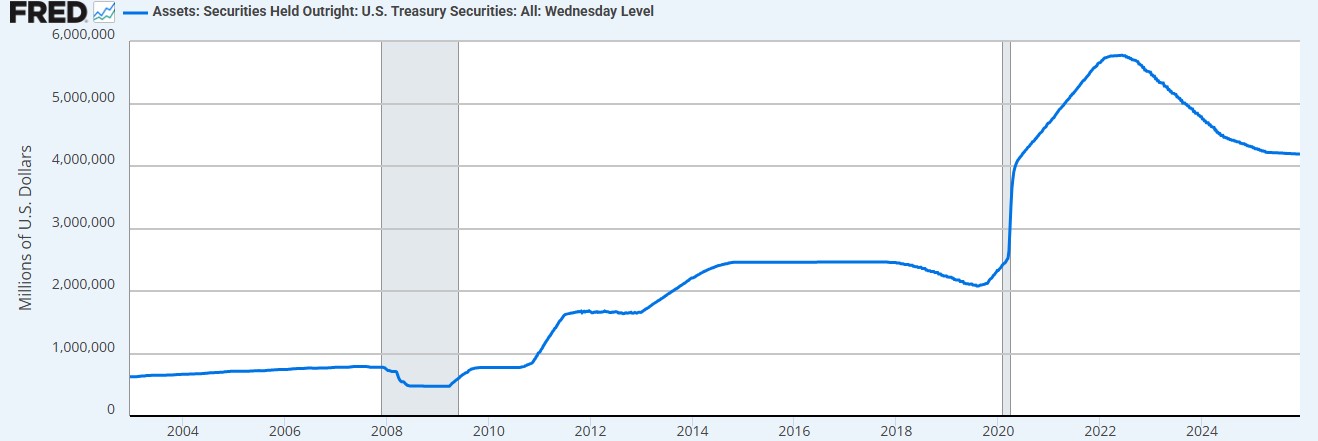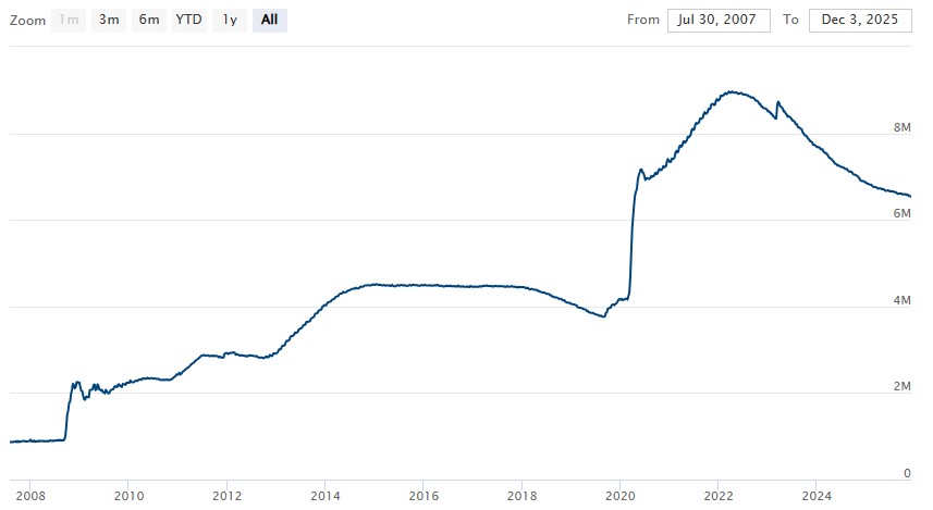 El programa de ajuste cuantitativo (QT, por sus siglas en inglés) de la Reserva Federal de Estados Unidos (FED) finalizó oficialmente el 1 de diciembre, tras más de tres años de reducción sistemática de activos del Banco Central, un factor que suele ser positivo para bitcoin (BTC).