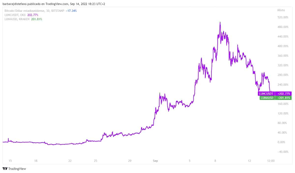 De este modo, se agudiza la caída que LUNA y LUNC venían haciendo los últimos 7 días, luego de la importante alza que tuvieron desde fines de agosto. Con el desplome que sufrieron en una semana, perdieron un tercio de la suba del 500% que habían logrado en menos de un mes. Tal crecimiento fue impulsado por el lanzamiento de un catalizador de la red.