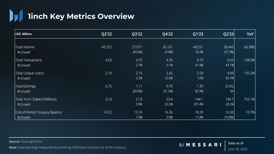 La firma también destaca que el protocolo de agregación de 1Inch pasó de tener 3,3 millones de usuarios en el primer trimestre, a 4,5 millones en el segundo. Mientras que el protocolo de orden límite de ese DEX pasó de tener 261 mil usuarios a 438 mil en tres meses.