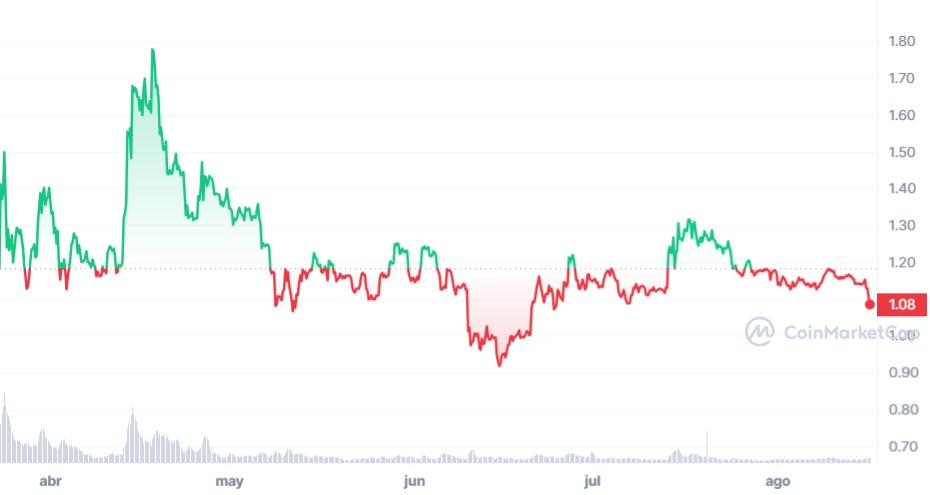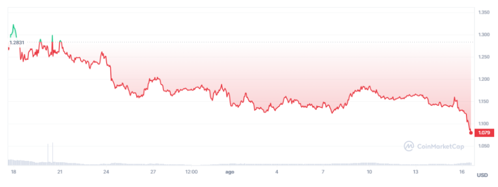 El precio de Arbitrum (ARB) acentuó este 16 de agosto la caída que viene teniendo desde hace un mes. Se desmoronó de USD 1,12, el soporte (mínimo) que formado en agosto.