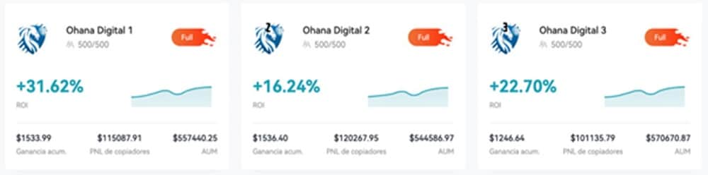 Con el éxito del primer perfil de trader profesional, Ohana y Cryptoburj crearon otros dos nuevos perfiles para ser copiados. Las 500 plazas para cada perfil se agotaron en menos de 24 horas. Las tres cuentas combinadas acumulan un beneficio para los copiadores (P&L de los seguidores) de más de USD 245.000.