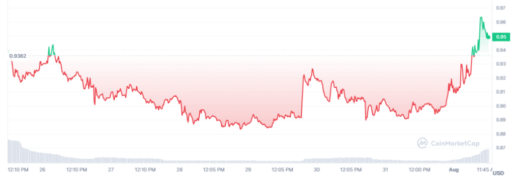 Como se observa en el siguiente gráfico, cada unidad de TWT llegó a cotizar USD 0,96 minutos atrás, para luego caer levemente.