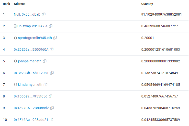 En los datos proporcionados por el explorador de la red Ethereum, Etherscan, se observa que existen 5.440 holders de HAY. Entre ellos se encuentra la dirección de quema (con 91,10 HAY destruidos para siempre) y el pool de liquidez de Uniswap, con 0,47 HAY.