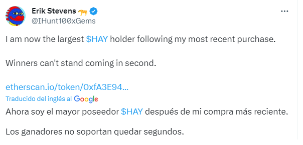 De las direcciones particulares, la que más HAY tiene es «sprotogremlin945.eth», del inversionista Erik Stevens, con 0,20001 HAY. Esto equivale al 4,76% del circulante total de esta moneda digital. Este individuo escribió horas atrás que se había convertido en el mayor poseedor de HayCoin.