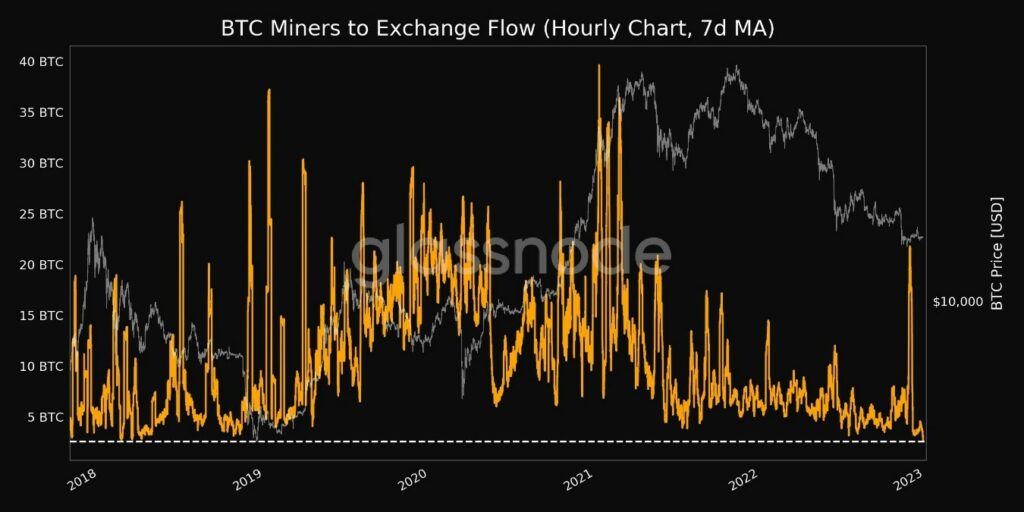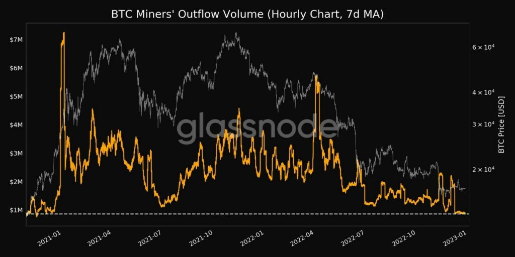 Los datos de seguimiento de la red Bitcoin de la firma Glassnode muestran que el flujo de bitcoins de direcciones asociadas con mineros ha caído a su nivel más bajo en los últimos 2 años. Específicamente, en la media móvil de 7 días tasada en dólares, con un volumen apenas superior a los 850.000 dólares.