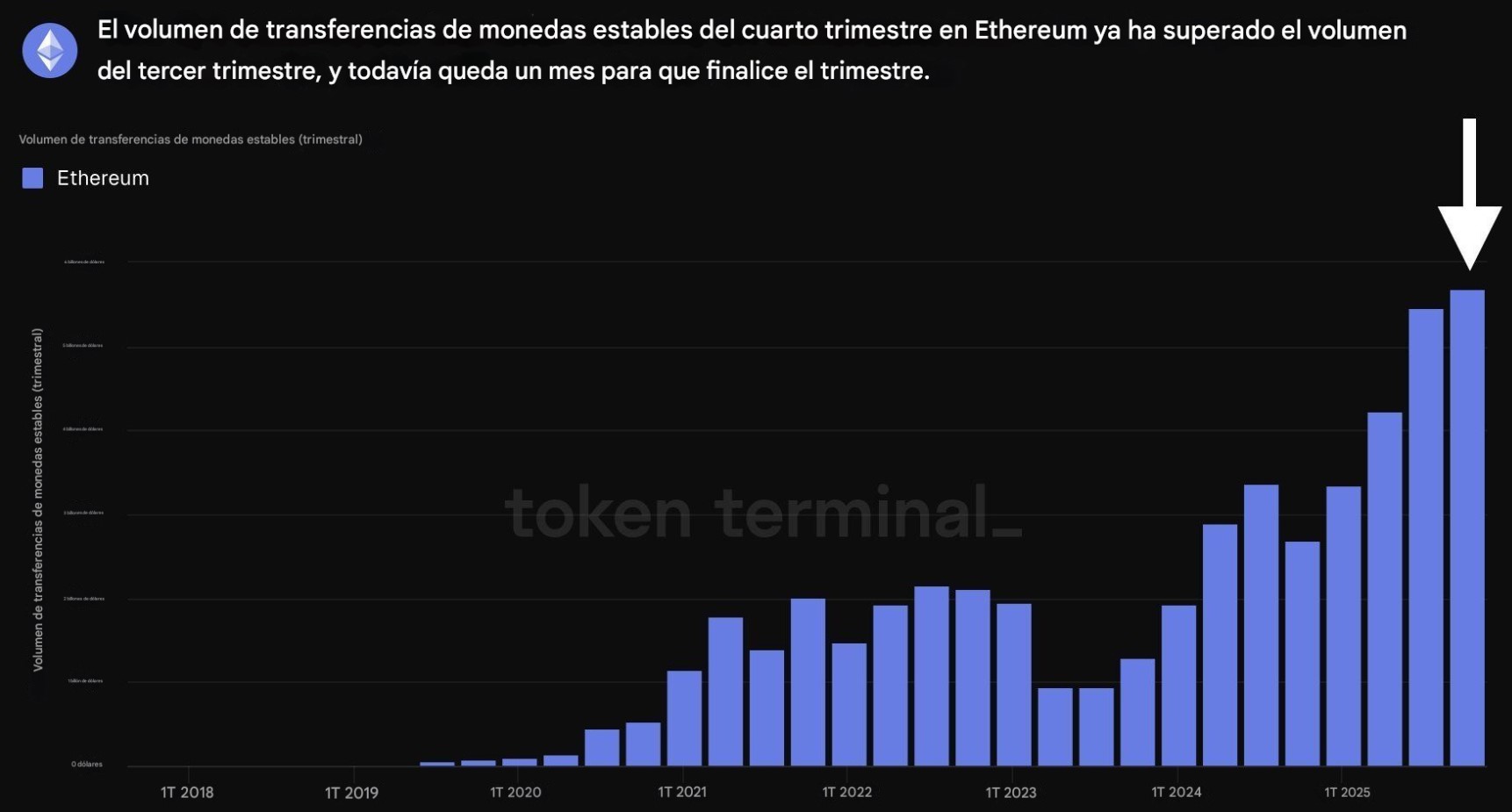 El gráfico de Token Terminal a continuación muestra que el volumen trimestral de transferencias en Ethereum se acerca ya a los USD 6 billones en el cuarto trimestre. Incluso con un mes aún por contabilizar.