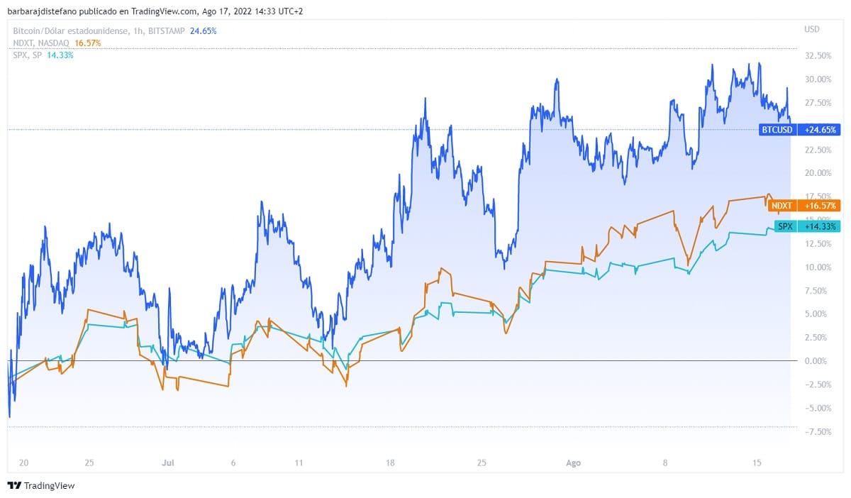 Además, el precio de bitcoin continúa comportándose de forma similar desde su mínimo anual a los índices de Nasdaq S&P 500 y NDXT. La mejora y estabilidad del mercado bursátil, motivada también por la menor inflación de Estados Unidos, es algo que puede haber impulsado a los traders a perder el miedo, dado que estos activos se han mantenido mayormente en correlación durante 2022.
