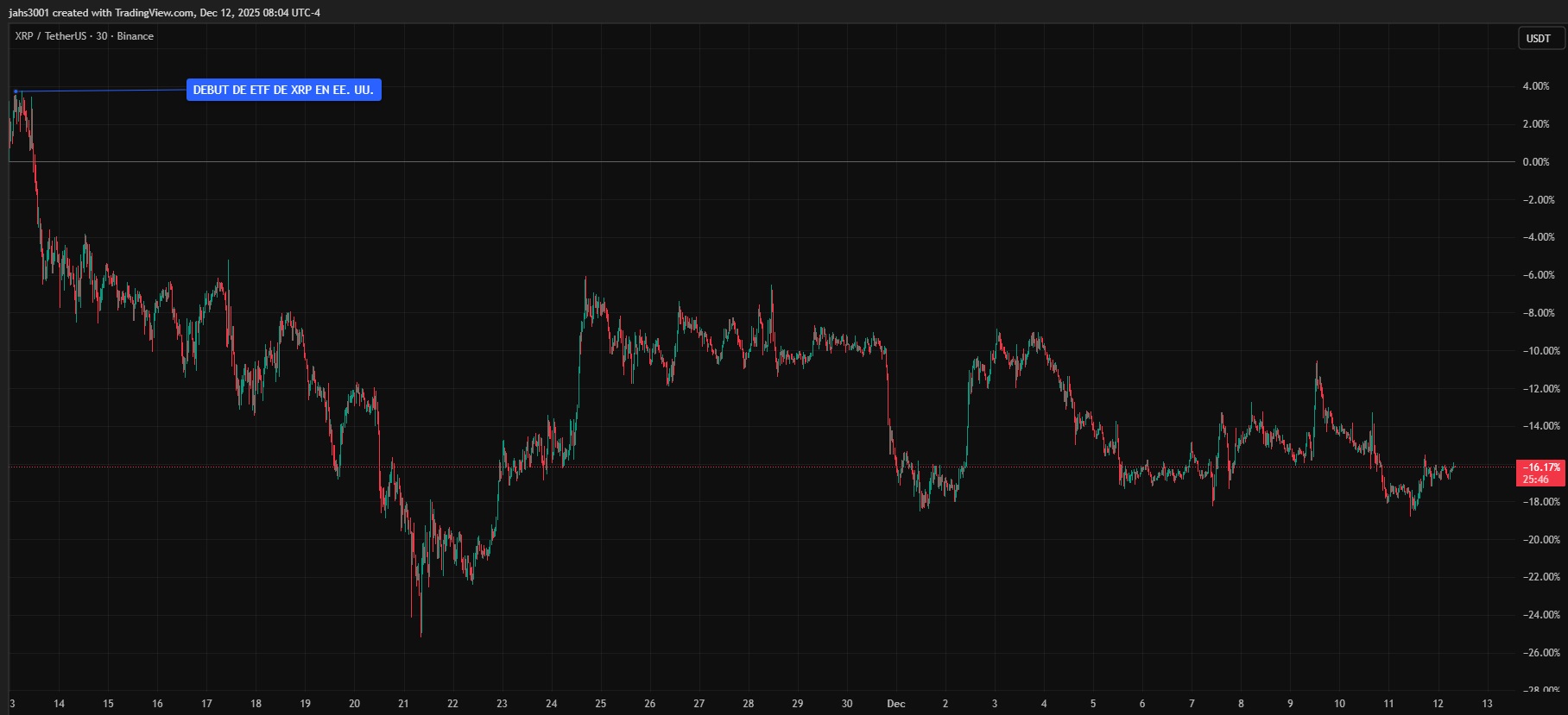 Muestra de ello es que XRP, la criptomoneda nativa de Ripple Labs, ha caído en un 17% desde el pasado 13 de noviembre. Ese fue el día del debut bursátil de los ETF de XRP. Así se aprecia en la gráfica a continuación: