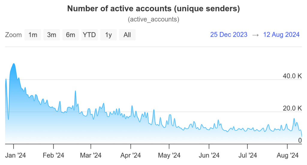 Uno de estos datos es e número de cuentas activas que ha registrado una disminución del 91% desde el 1 de enero hasta el 12 de agosto. Estas pasaron de 49.851 en enero a 4.397 en la jornada de ayer, como se ve a continuación.