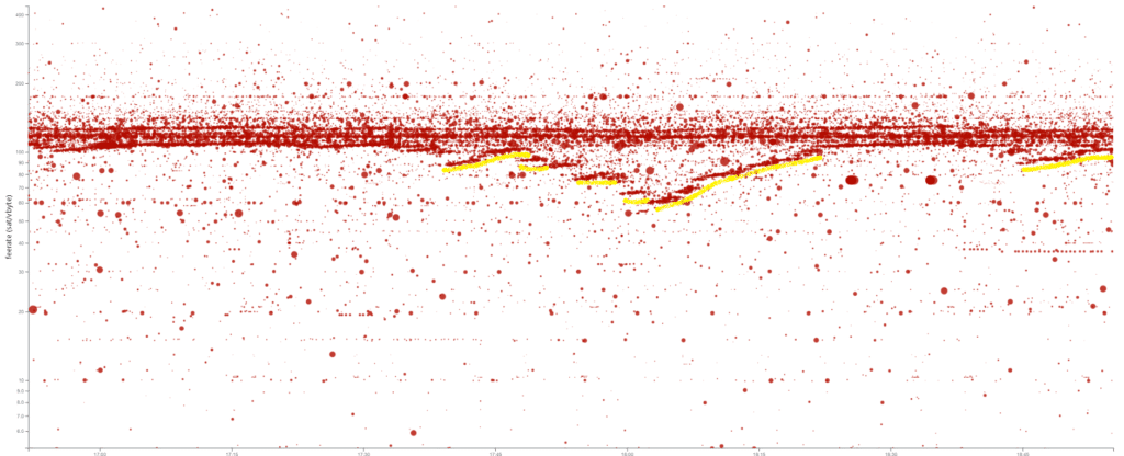 Los usuarios de Blockchain.com, en general, siguen las recomendaciones de tarifa que la plataforma les ofrece. Se observa en la siguiente imagen, una gran cantidad de envíos que utilizan exactamente las tarifas sugeridas por esta billetera. Al momento de la redacción de este artículo eran de 89 sat/vbite (la opción “Regular”) y de 119 sat/vbite (la opción “Prioridad”):