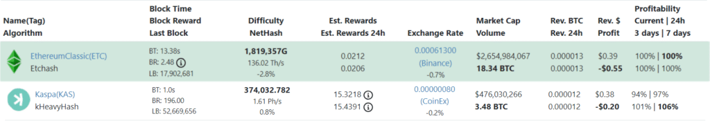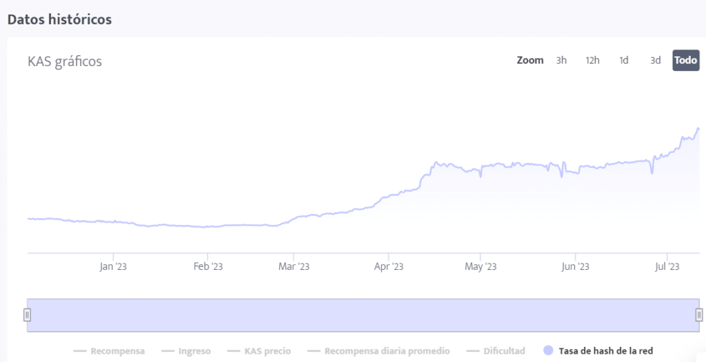 En tanto, la minería de Kaspa paga recompensas de 15,32 KAS diarias al cierre de esta nota, según Whattomine. Esto equivale a USD 0,37 al día. Ambas cifras se calculan usando los datos por defecto del sitio, que incluyen tres GPU Nvidia 3070 y un costo eléctrico de USD 0,1 kW/h.