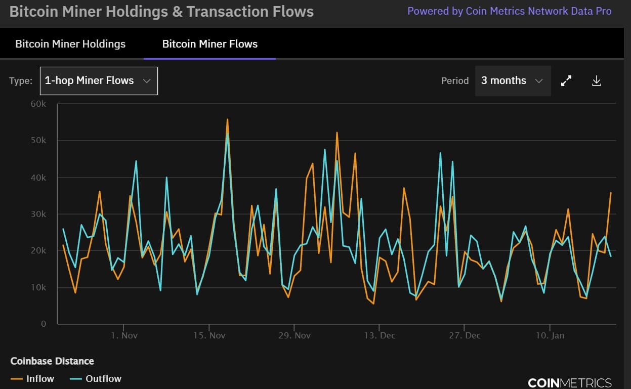 Como se puede ver en el gráfico de abajo, la salida de bitcoin de las direcciones de mineros (línea celeste) se encuentra en este momento bastante por debajo de las entradas de bitcoin a estas direcciones (línea naranja). Algo así no ocurría desde mediados de diciembre.
