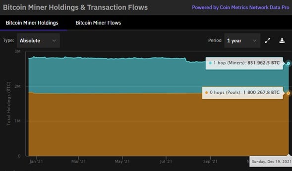 De acuerdo con la gráfica de CoinMetrics compartida en la web de la compañía, los mineros albergan tenencias de unos 850 mil bitcoins, esto al cierre del 18 de diciembre.