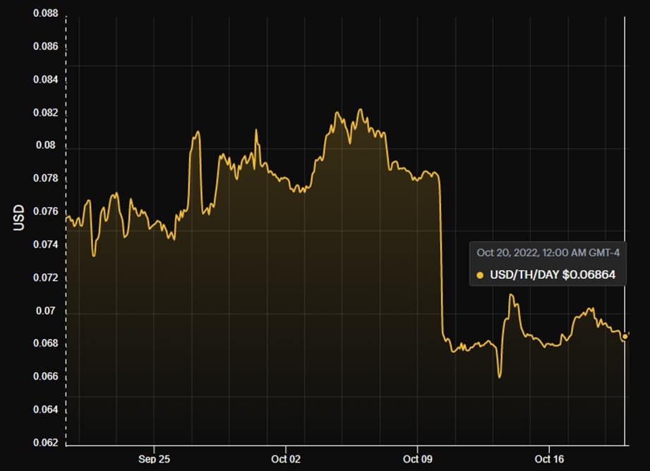 En el lapso de las últimas dos semanas, el hahsprice de bitcoin también sufrió consecuencias negativas. Este es un valor que se asigna a una unidad de poder de cómputo (otra forma de denominar el hashrate). El hashprice se designa en dólares (USD) y es un estimado de la ganancia diaria que se obtiene por cada terahash (TH) que invierte un equipo de minería en la red.