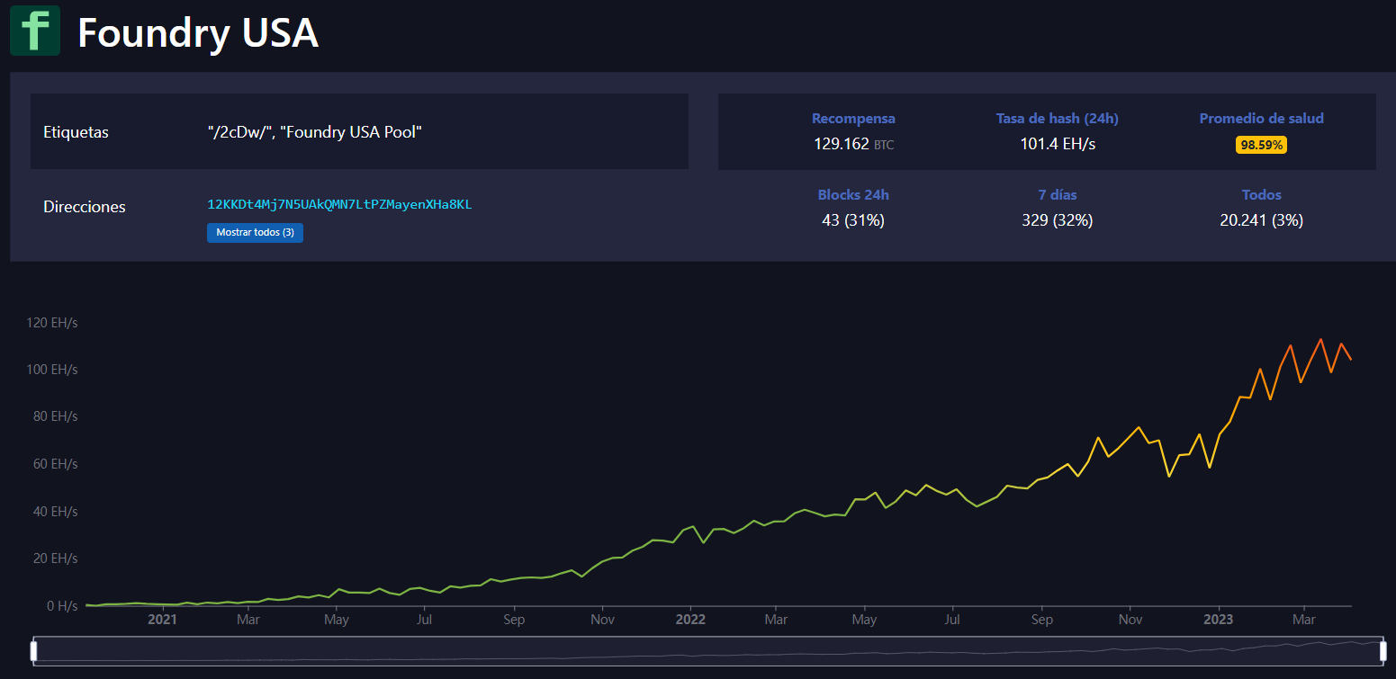 Foundry es el pool de minería de Bitcoin más grande del mundo por hashrate o poder de cómputo, con una participación del 32% del total de la red. En este periódico se reportó a fines de enero cómo Foundry y Antpool concentran más del 50% del poder de procesamiento de toda la red, algo que muchos señalan como un riesgo de centralización.
