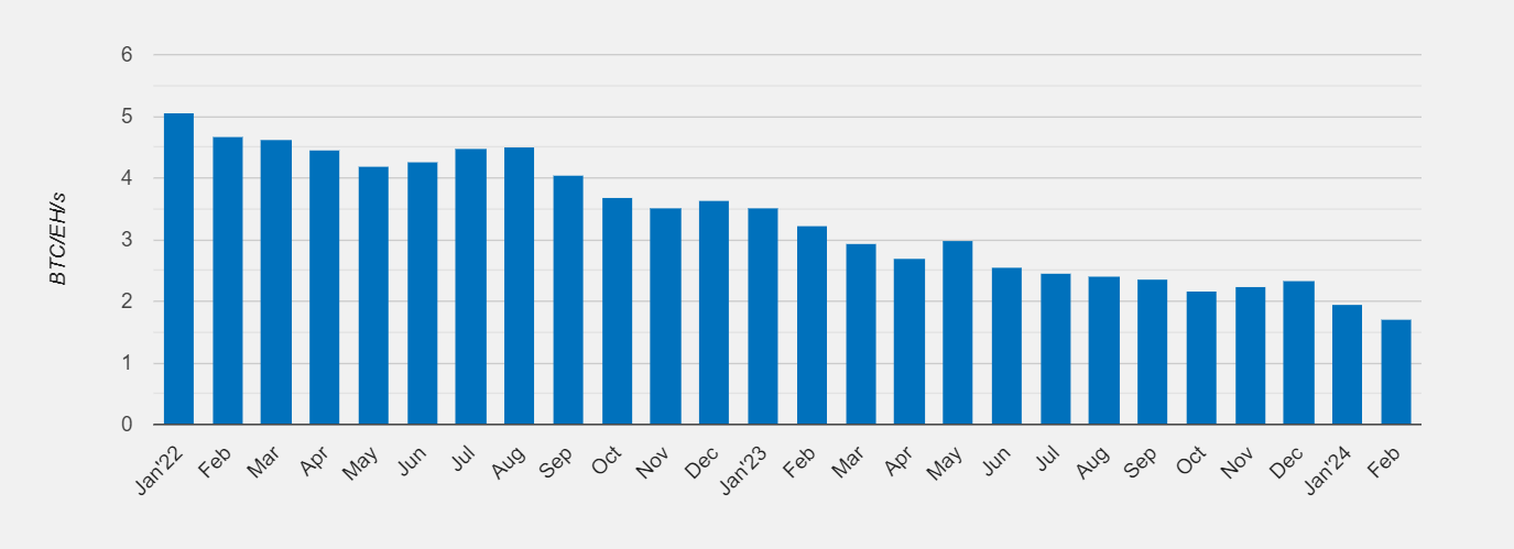 La producción diaria medida en BTC/EH/s viene en descenso desde 2022. Con respecto a los últimos meses, en enero de 2024 había sido de 1,94 BTC; en los últimos meses de 2023 fue de 2,33 BTC (diciembre), 2,23 BTC (noviembre), 2,17 BTC (octubre) y 2,35 BTC (septiembre).