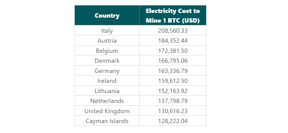 Esta lista la encabeza Italia, con un costo de USD 208.560 por bitcoin. Le siguen Austria, Bélgica, Dinamarca, Alemania, Irlanda, Lituania, Países Bajos, Reino Unido y las Islas Caimán.