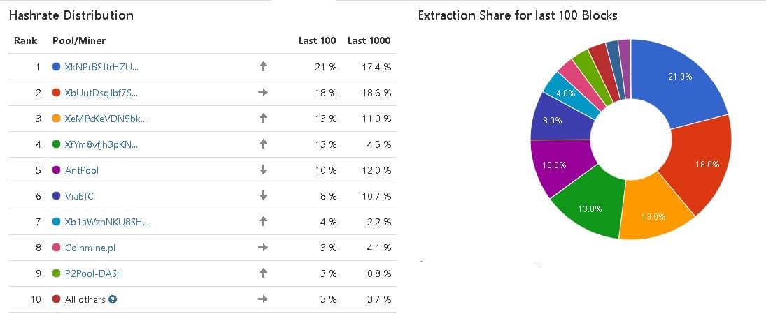 Al momento de la redacción, el explorador de bloques de Dash, CryptoID, arrojó que las 4 direcciones que poseen la mayor tasa de hash de la red pertenecen a un grupo de minería desconocido. Además, estas cuatro tienen transacciones que la vinculan a una sola dirección principal de un usuario desconocido. La primera de ellas posee 21% de la tasa de hash de los últimos 100 bloques, y el 17,4% de los últimos 1.000. La segunda, posee el 18% de los últimos 100 y 18,6% de los últimos 1.000. La tercera y cuarta dirección poseen 13% y 13% de los últimos 100 y 11% y 4,5% de los últimos 1.000, respectivamente.