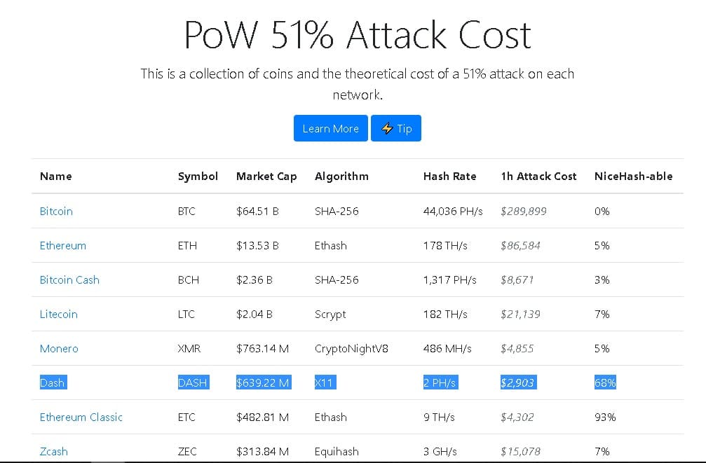 Actualmente, NiceHash tiene disponible el 68% del poder de minado de Dash, por lo que un ataque podría provenir del alquiler de HashRate de esta plataforma. Las estadísticas que este sitio web arroja son de 28.841 mineros que alquilan 1163,72 TH/s a un costo de 0,0121 BTC por TH al día. No obstante, esta tarifa podría aumentar si las órdenes aumentan, por lo que el costo de llevar a cabo un ataque del 51% durante una hora podría aumentar. Existen 1.317 órdenes activas en este sitio al momento de la redacción.