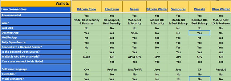 En ese sentido, Veriphi publicó un documento que permite comparar con facilidad las diferentes funcionalidades de 26 monederos populares de Bitcoin. Para ello, los analistas usaron criterios que consideraron esenciales para la comunidad, basando las recomendaciones en su juicio de seguridad, anonimato y soberanía.