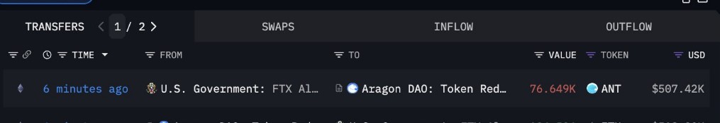El gobierno de Estados Unidos cambió más de 160.000 tokens Aragon (ANT) por ether (ETH), la criptomoneda de la red Ethereum. Según datos on-chain identificados por Arkham Intelligence, este intercambio se efectuó desde un monedero vinculado a Alameda Research.