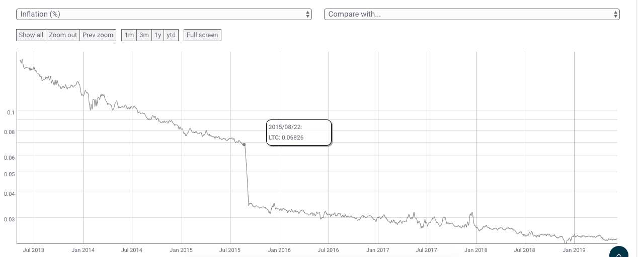 La inflación actual en la oferta de Litecoin es de alrededor del 8,4% por año. Sin embargo, después de la reducción a la mitad, se espera que la tasa de inflación de la red caiga a 4% por año, aunque dicha reducción no es brusca como la de la tasa de emisión diaria. Esto conlleva, de todos modos, a que los mineros perciban menos ganancias por la misma cantidad de esfuerzo.