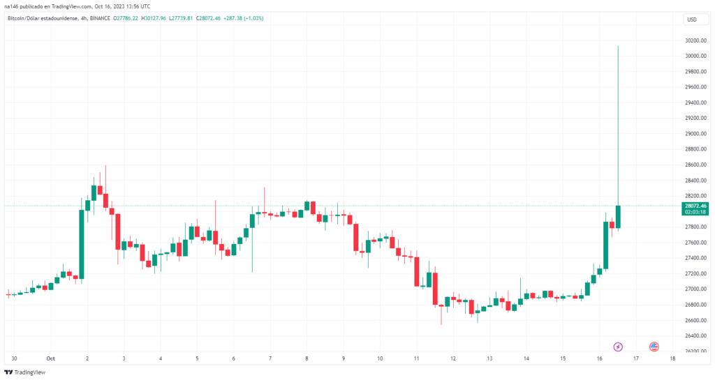 Incluso, luego de que circularan rumores sobre la supuesta aprobación de un ETF por parte de la SEC, el precio se disparó por sobre los 30.000 dólares, tal como se observa en el siguiente gráfico provisto por TradingView: