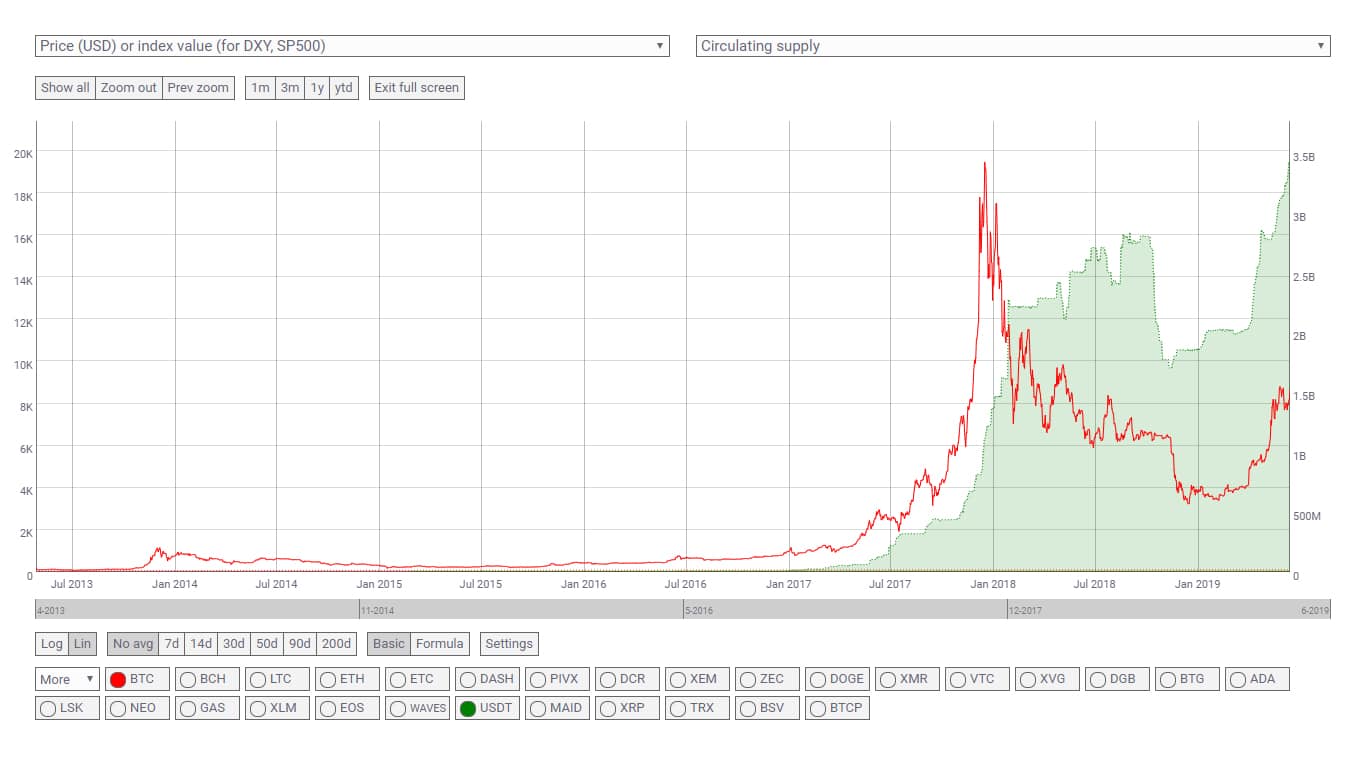 Ya para comienzos del 2019 la correlación fue mucho más marcada. USDT alcanzó sus máximos históricos en cuanto a circulación total crece hasta los 3,5 mil millones de tether, esto ha sido respaldado con el aumento en los precios de Bitcoin desde los USD 3.800 a mediados de febrero. Con la principal moneda por capitalización de mercado rondando en los USD 9.000 y un circulante de USDT por las nubes, el desempeño del precio se convertirá en una prueba de fuego para comprobar que tan fuerte están correlacionados estos activos.