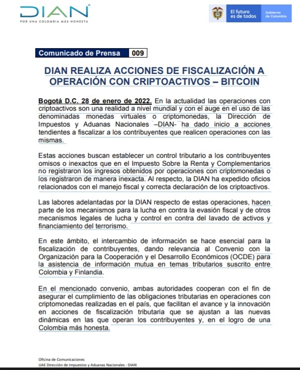 La Dirección de Impuestos y Aduanas Nacionales de Colombia (DIAN) ha comenzado “acciones tendientes a fiscalizar a los contribuyentes” que operen con criptomonedas como bitcoin (BTC). La medida apunta a aquellas personas que no hayan declarado sus ingresos por esta actividad en el Impuesto sobre la renta y complementarios.