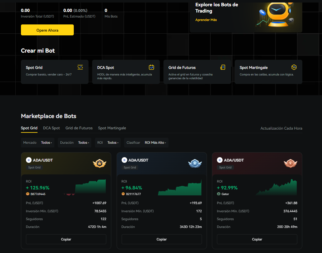 BYDFi ofrece un panel de bots integrados que cubren estrategias habituales: Grid Trading, DCA (promedio de costo), spot martingale y bots para futuros. Estos bots permiten parametrizar rangos de operación, inversión total, tamaño de grid y condiciones de stop, y son una herramienta accesible para automatizar actividades sin programar.