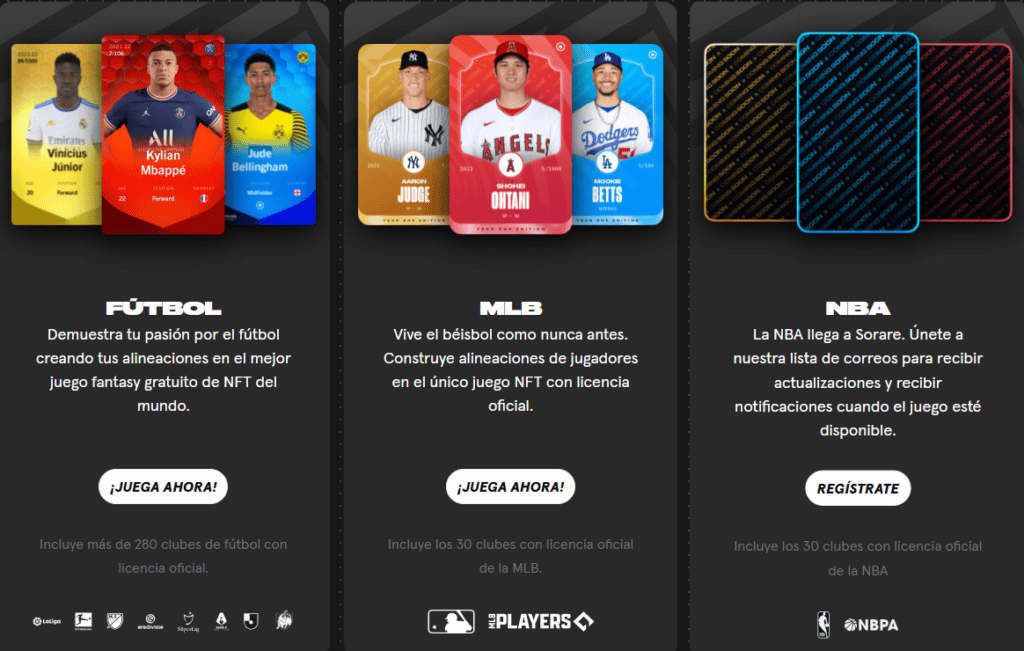 Sorare posee una cantidad descomunal de licencias oficiales de Futbol Internacional en constante crecimiento y de la Major League Baseball (MLB). Este otoño, también poseerá derechos del Baloncesto de la NBA.