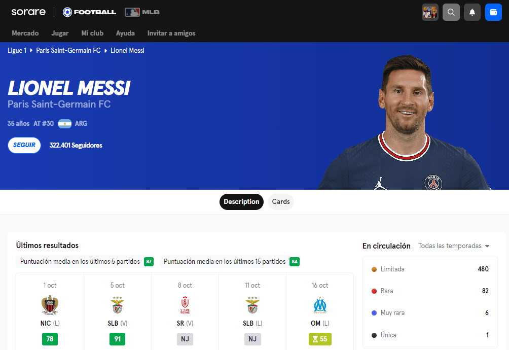 El mercado NFT de Sorare se siente vivo y activo. La interfaz, pese a ser atractiva y cómoda, no queda íntegramente traducida al cambiar de inglés a español.