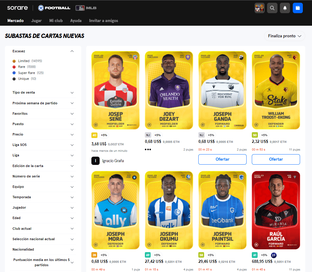 Este mercado está lleno de movimiento y resulta sencillo y claro de navegar a través de él. El buen tráfico de Sorare se percibe en la buena cantidad de pujas que hay en la zona de subastas. Por su parte, la gran y variada cantidad de filtros permiten un scouting con lujo de detalles.