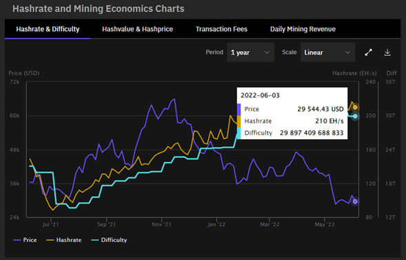 El hecho es que, durante mayo, el hashrate marcó nuevos máximos históricos de 231 EH/s. En ese momento, el precio de bitcoin comenzaba a emprender una racha bajista que llevó a la rentabilidad de la minería a mínimos de 2020, demostrando una interesante correlación negativa entre precio y la tasa de hash que se mantuvo hasta los últimos días de ese mes.