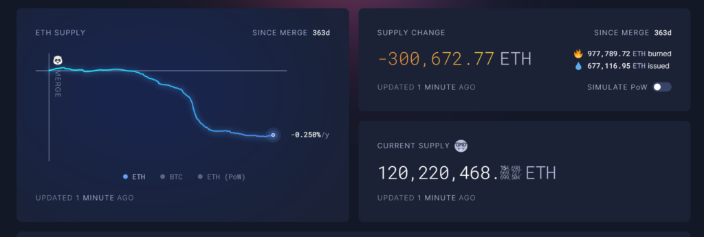 Desde que ocurrió el Merge, existen 300.760 ethers (ETH) menos, de acuerdo con datos del sitio ultrasound.money. La cifra representa un 0,25% del suministro total de la criptomoneda.