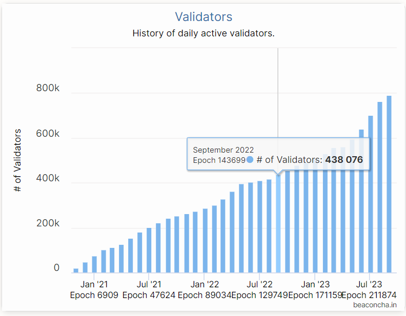Al momento de redacción de esta nota, hay 791.142 validadores activos en Ethereum. Al momento del Merge, había 438.076 validadores. La diferencia implica un crecimiento del 75%, aproximadamente.
