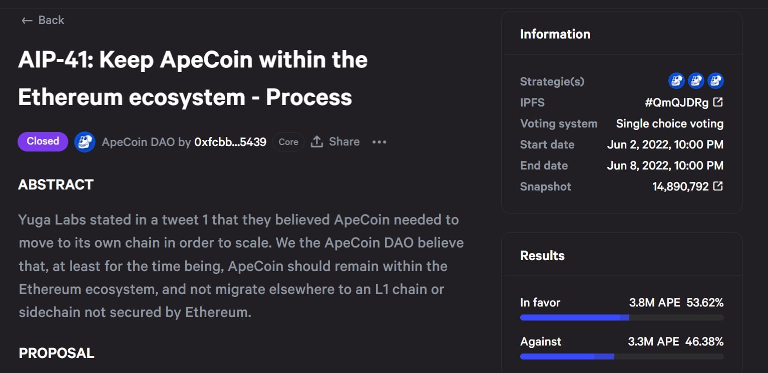 La AIP-41 (propuesta de mejora de ApeCoin) fue creada por el miembro de la DAO ASEC (@bayc2491 en Twitter). El autor de la iniciativa asegura en ella que ApeCoin y Bored Ape no deben migrar a una red que no ofrezca la seguridad de Ethereum.