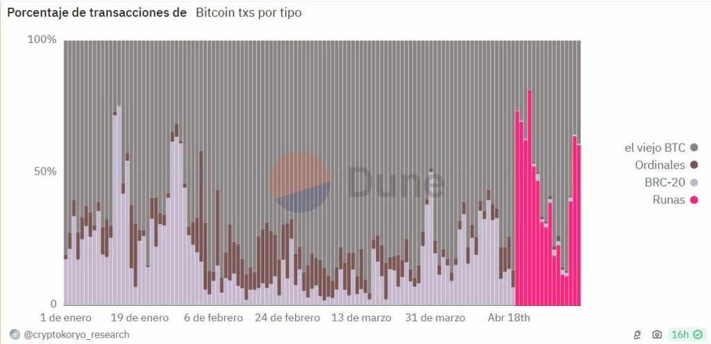 Tal como lo muestra Dune Analytics, las transacciones de Runes abarcan, desde el pasado fin de semana, más del 60% de las operaciones diarias ejecutadas en la red Bitcoin. Esto indica un resurgimiento del interés por el protocolo, que se vio disminuido un par de semanas después de su lanzamiento.