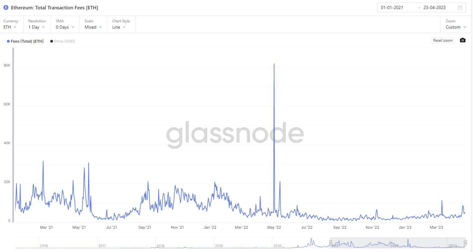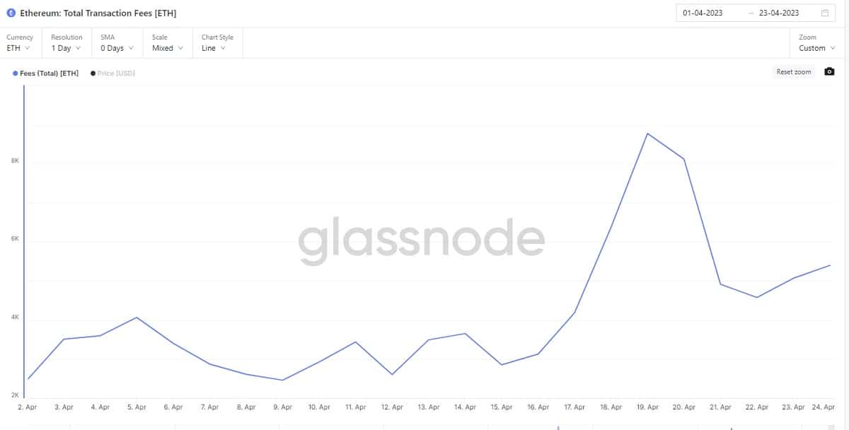 De acuerdo con datos provistos por la plataforma de analíticas on-chain Glassnode, el 19 de abril se pagaron 8.767 ETH en gas en total. Tres días más tarde, el 22 de abril, ese monto descendió a 4.573 ETH. Al cierre de esta nota, la cifra se encontraba en ascenso nuevamente, superando los 5.390 ETH el lunes 24.