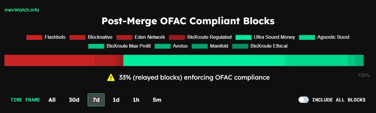 El porcentaje de validadores de Ethereum que cumplen normas de la OFAC (Oficina de Control de Bienes Extranjeros de Estados Unidos) bajó del 79% al 29% en un periodo de seis meses. En noviembre de 2022, 4 de cada 5 bloques podían ser censurados si no cumplían con las leyes del gobierno estadounidense.
