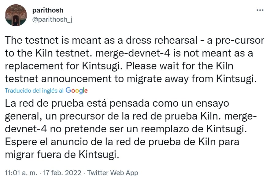 Sin embargo, Jayanthi menciona en su tuit que la merge-devnet-4 “no es un reemplazo de Kintsugi” y que los desarrolladores no deben migrar sus testeos a Kiln hasta que no se les indique hacerlo. No se especificó una fecha en la que la versión definitiva de la testnet estaría disponible.
