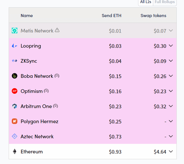 De acuerdo con lo que muestra el portal L2fee, zkSync está entre los rollups con comisiones más bajas. Al momento de esta publicación, mientras en la red principal se paga un promedio de USD 0,90 por operación, en este rollup se paga USD 0,04.